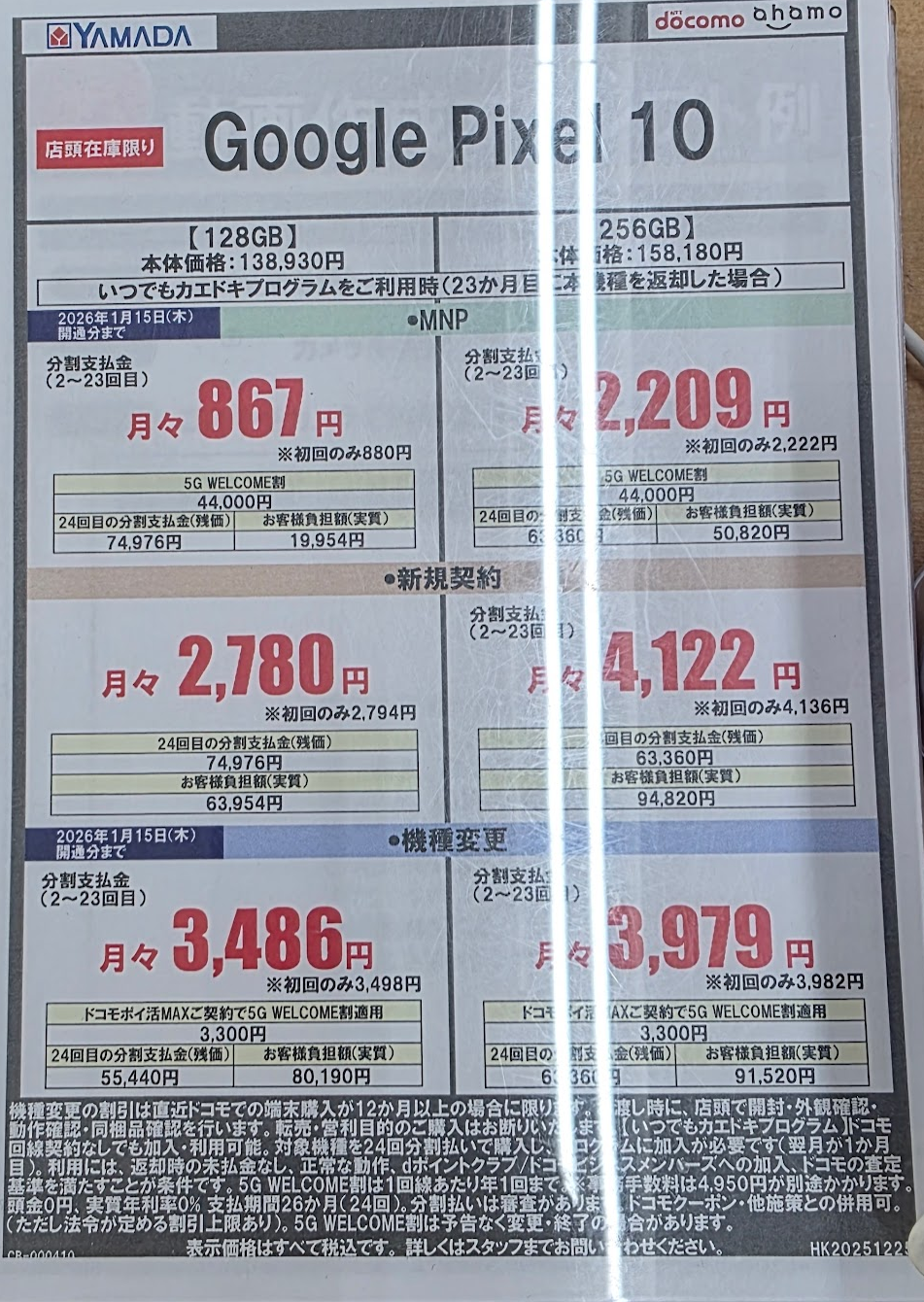 ドコモの施策ですが、Pixel10が867円で投げ貸し施策に変更になっています。