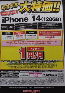 2024年3月9日、ヨドバシカメラのソフトバンクコーナーから、他社からの番号持ち運び(MNP)を利用した顧客向けに、「iPhone14」を実質1円で提供するという施策が行われています。