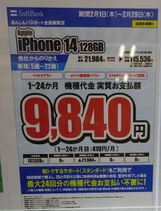 2024年2月3日調査してきました。ケーズデンキでは、「iPhone 14」が、MNPで実質410円で投げ売りとなっています。