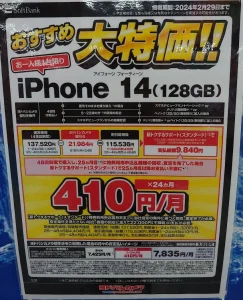 2024年2月10日の最新の市場調査によると、ヨドバシカメラでは、非常に魅力的なプロモーションが行われていることが明らかになりました。その中心にあるのは、Appleの最新スマートフォンである「iPhone 14」です。このデバイスがMNP(携帯電話会社間の乗り換え)を利用した顧客に対して、実質410円という驚異的な低価格で提供されています。このプロモーションは、「新トクするサポート(スタンダード)」というプランのもとで実施されており、24ヶ月間の契約期間中に端末を返却することが条件とされています。