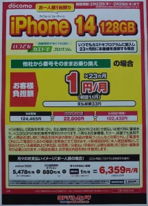 市場をリードする「iPhone 14」が、MNP(モバイル・ナンバー・ポータビリティ、すなわち他社からの乗り換え)を活用することで、信じられないほどの月々たったの1円で提供されるというのです!
