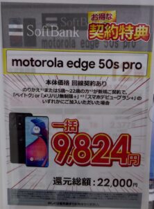 ビックカメラ motorola edge 50s proがMNP利用で驚きの一括投げ売り! 2024年10月12日、ビックカメラのソフトバンクコーナーにて、MNP(番号持ち運び)を利用するユーザ...