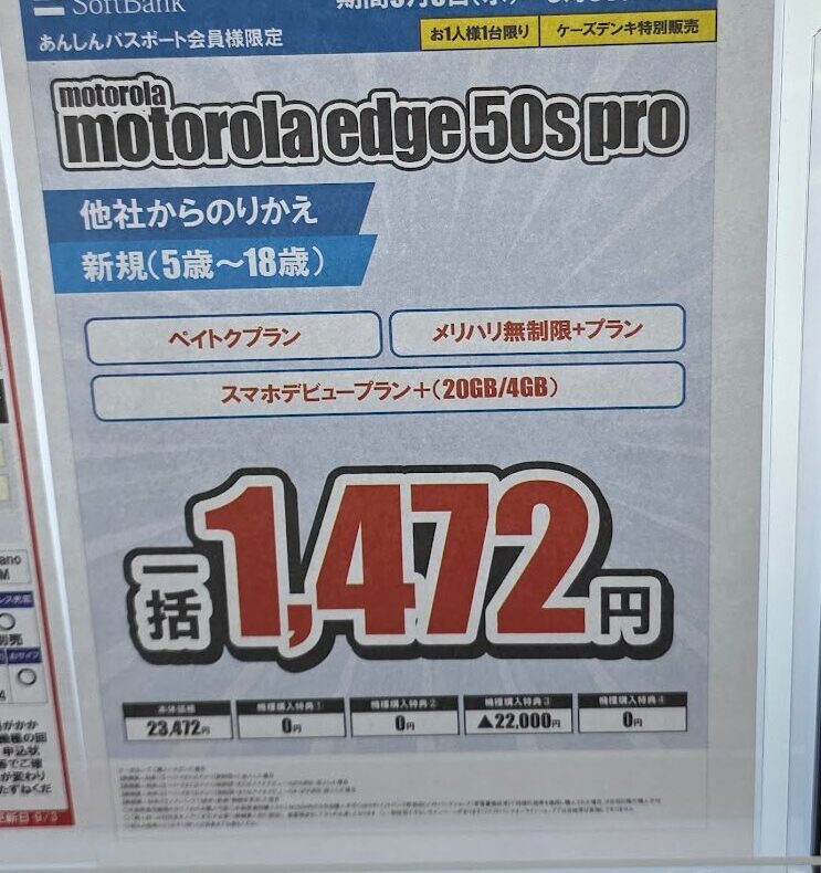 motorola edge 50S proが大幅値下げ、一括価格での販売になっています。