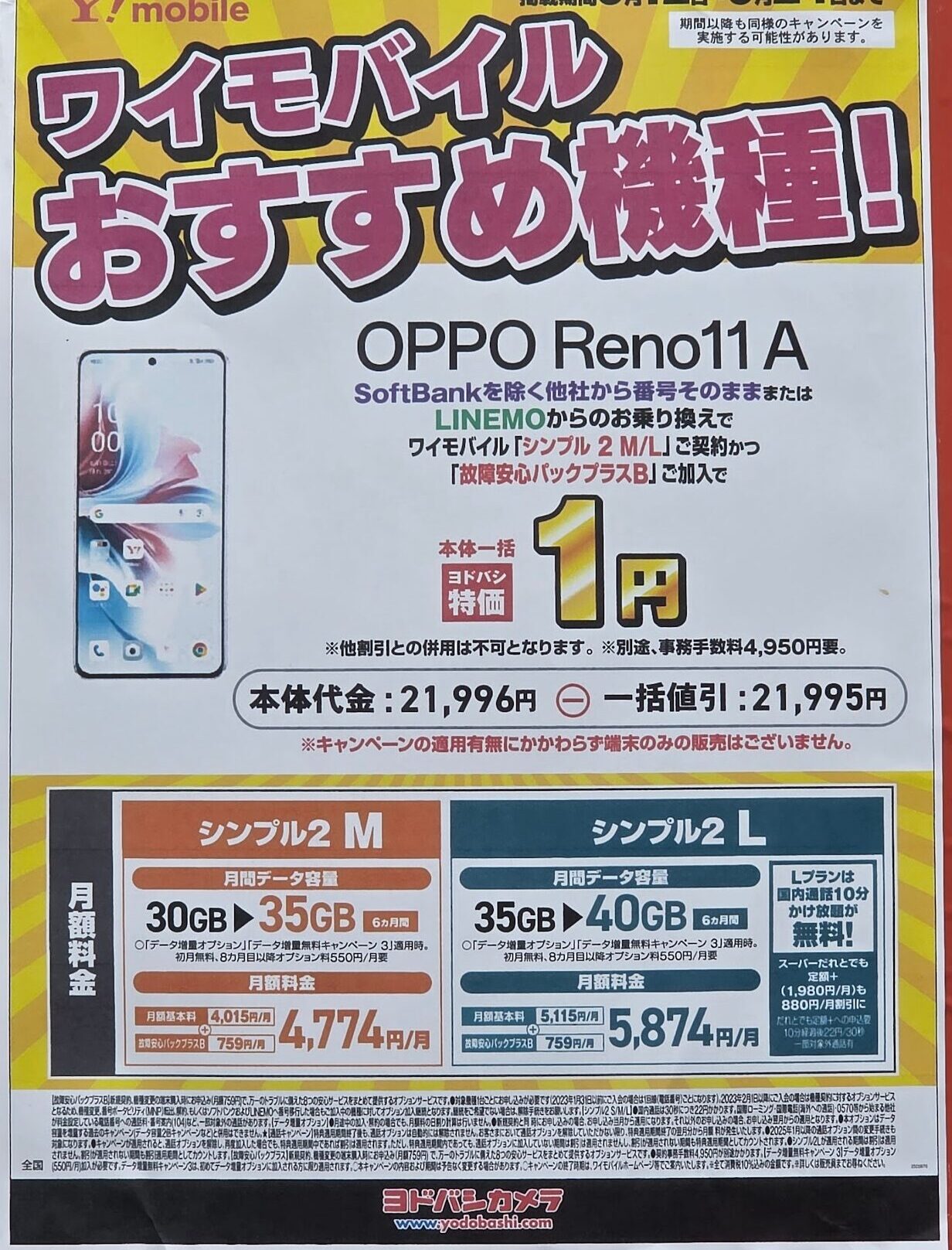 ワイモバイルではOPPO Reno11Aが一括1円に変更