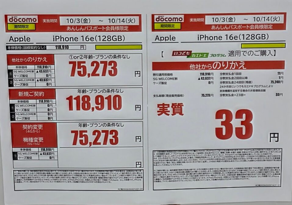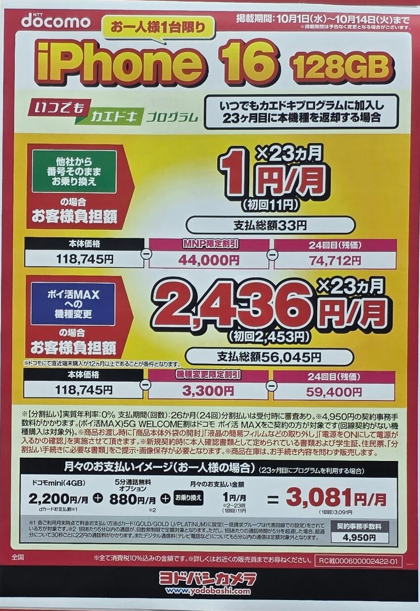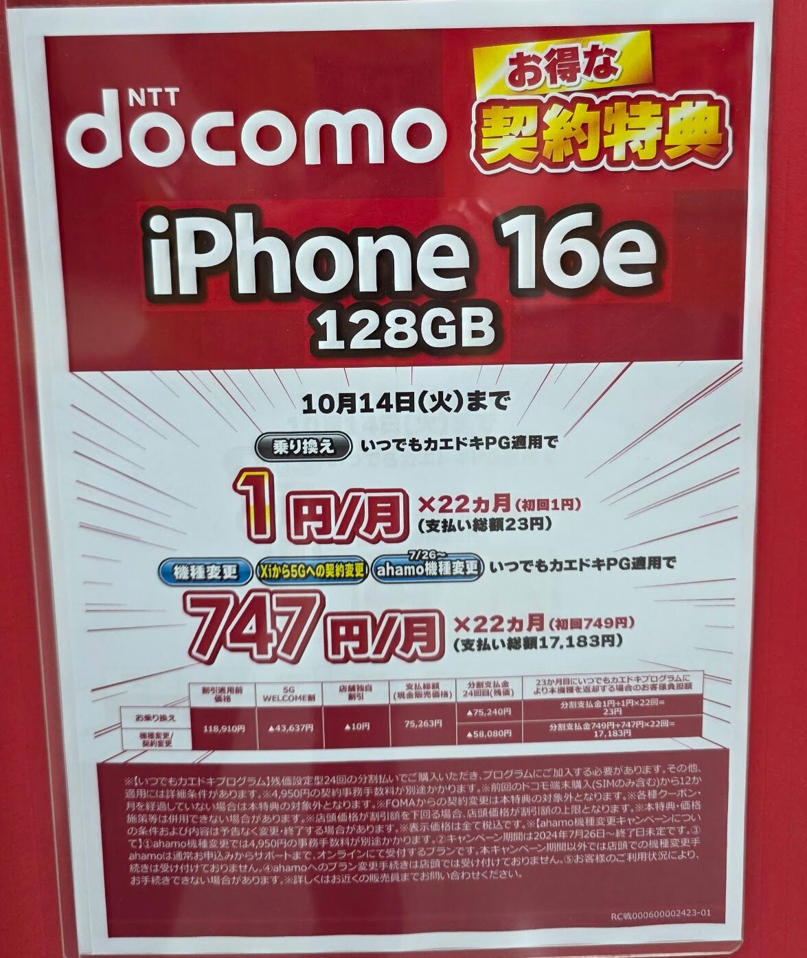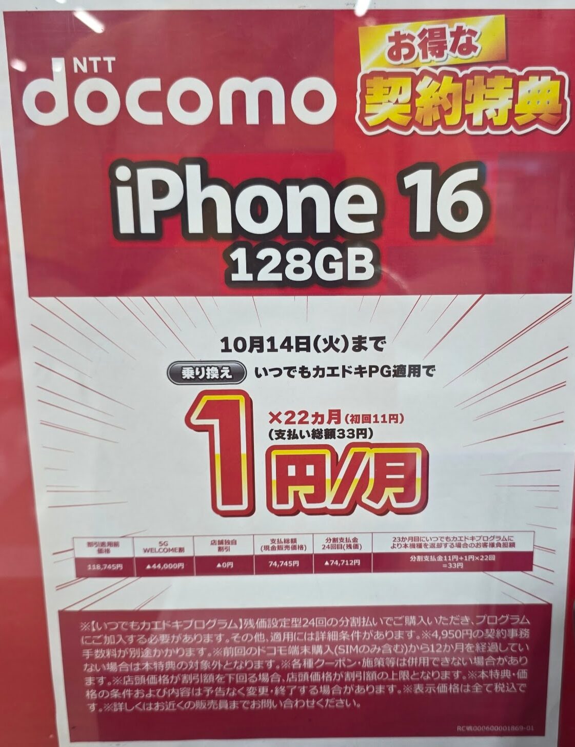 ドコモはiPhone16の価格を変更しました。今週から1円に施策を変更しております。