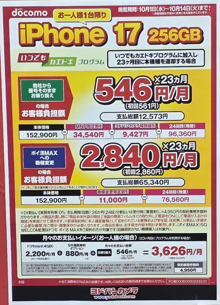 ヨドバシカメラのスマートフォン売り場ではiPhone17がまさかの価格でレンタルされています。月々546円です。これ先週までは1300円以上の価格でしたが大幅に値下げとなっています。