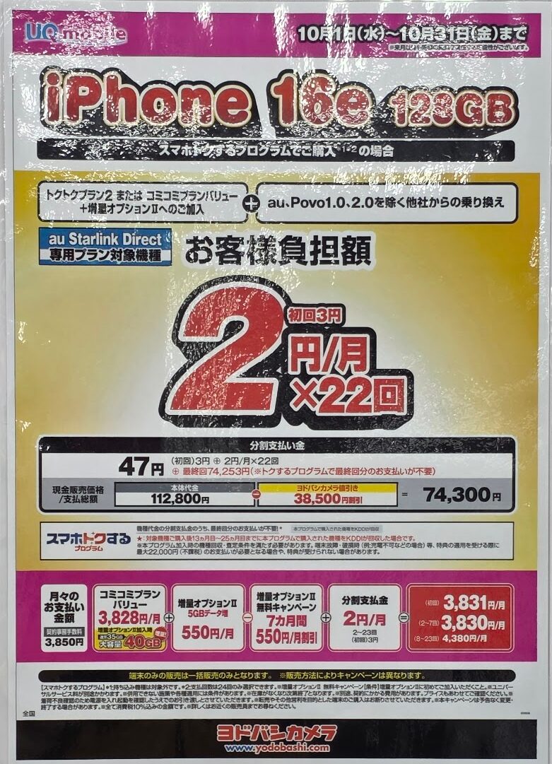iPhone16eはドコモのビックカメラで機種変更でも大幅値下げとなっております。