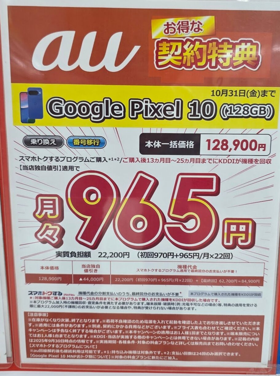 ヨドバシカメラのauでは、Pixel8aが分割で31,500円の施策に変更されています。