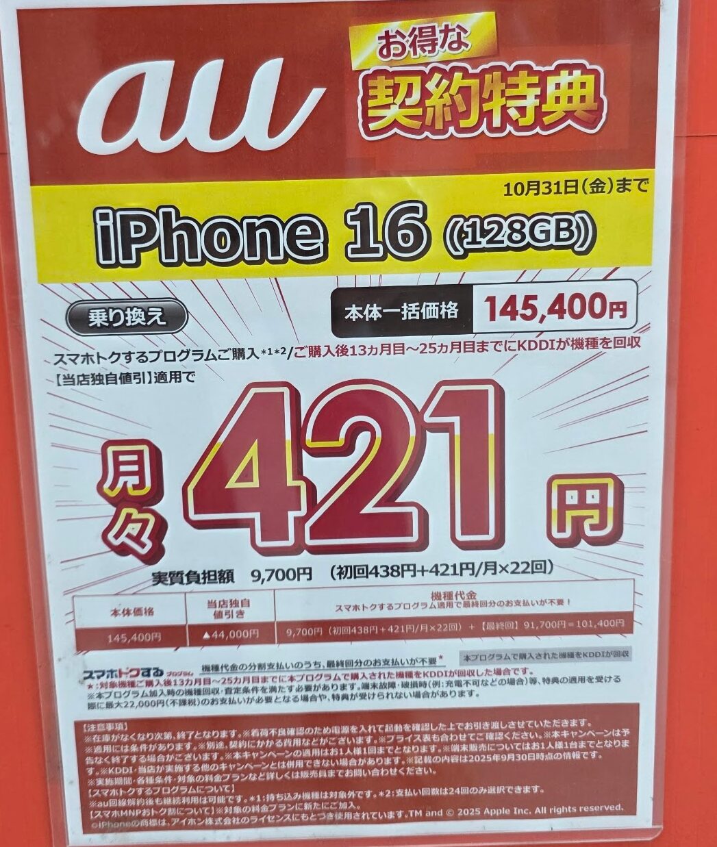 今週からauのiPhone16では月額426円に値下げとなっております。