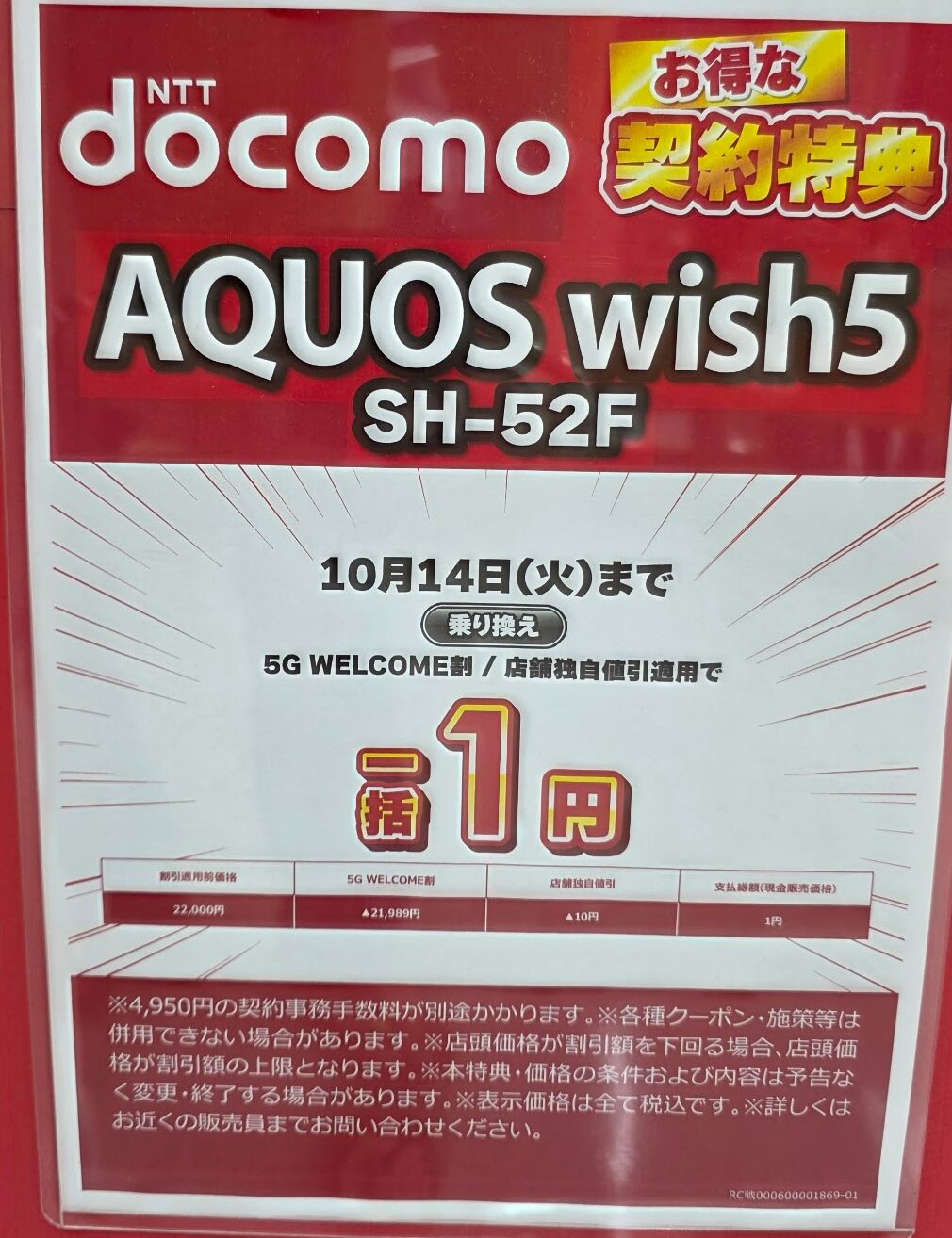 ヤマダ電機とケーズデンキでは、こちらもAQUOSシリーズの最新機種AQUOS Wish 5が一括14,800円にて販売中となっています。