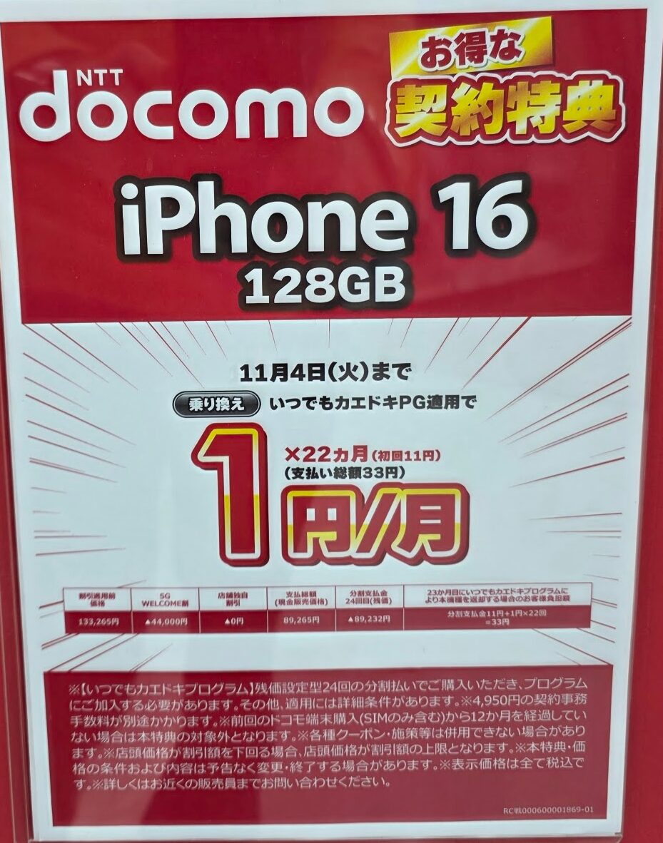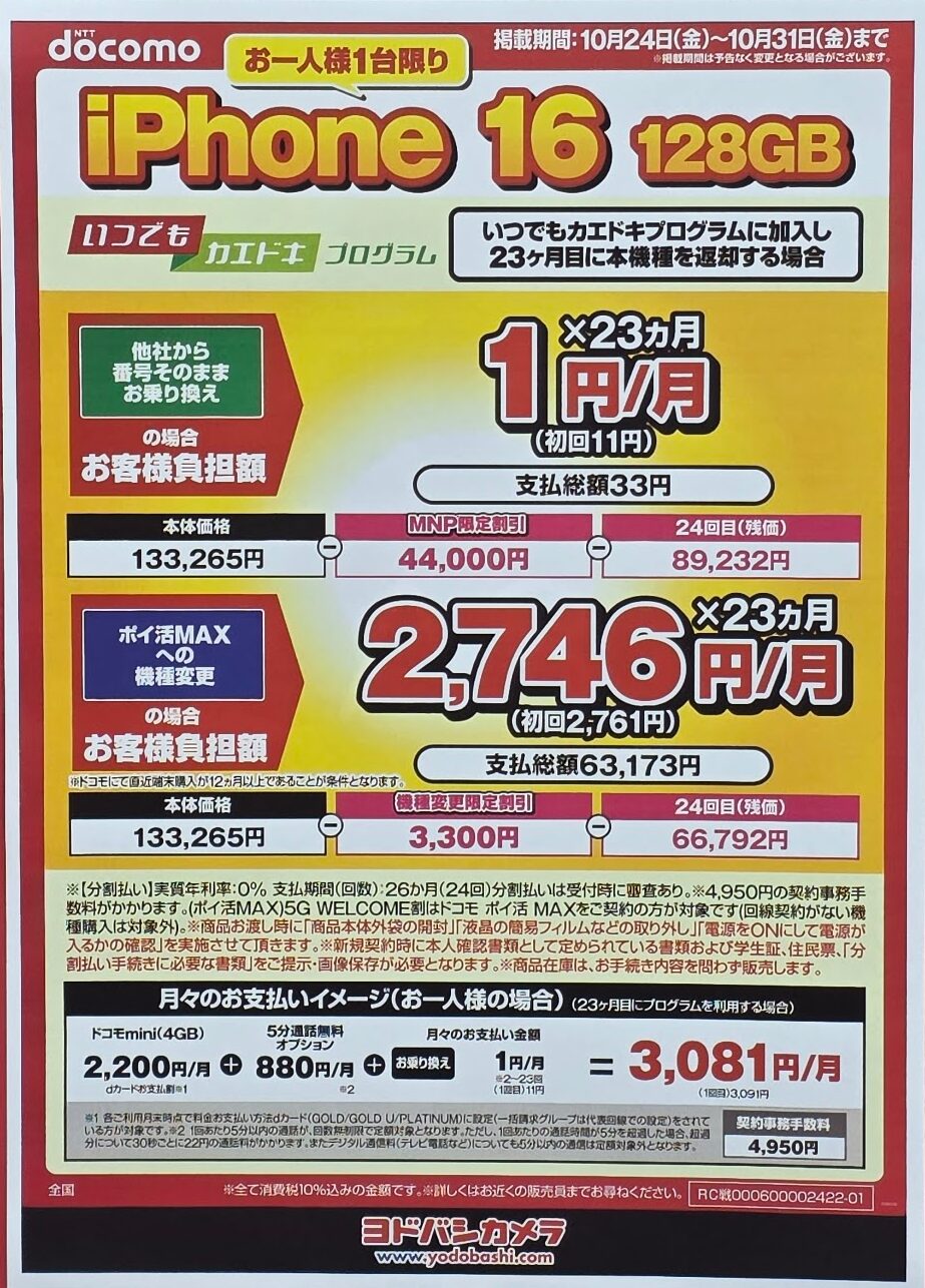 iPhone16eはドコモのビックカメラで機種変更でも大幅値下げとなっております。