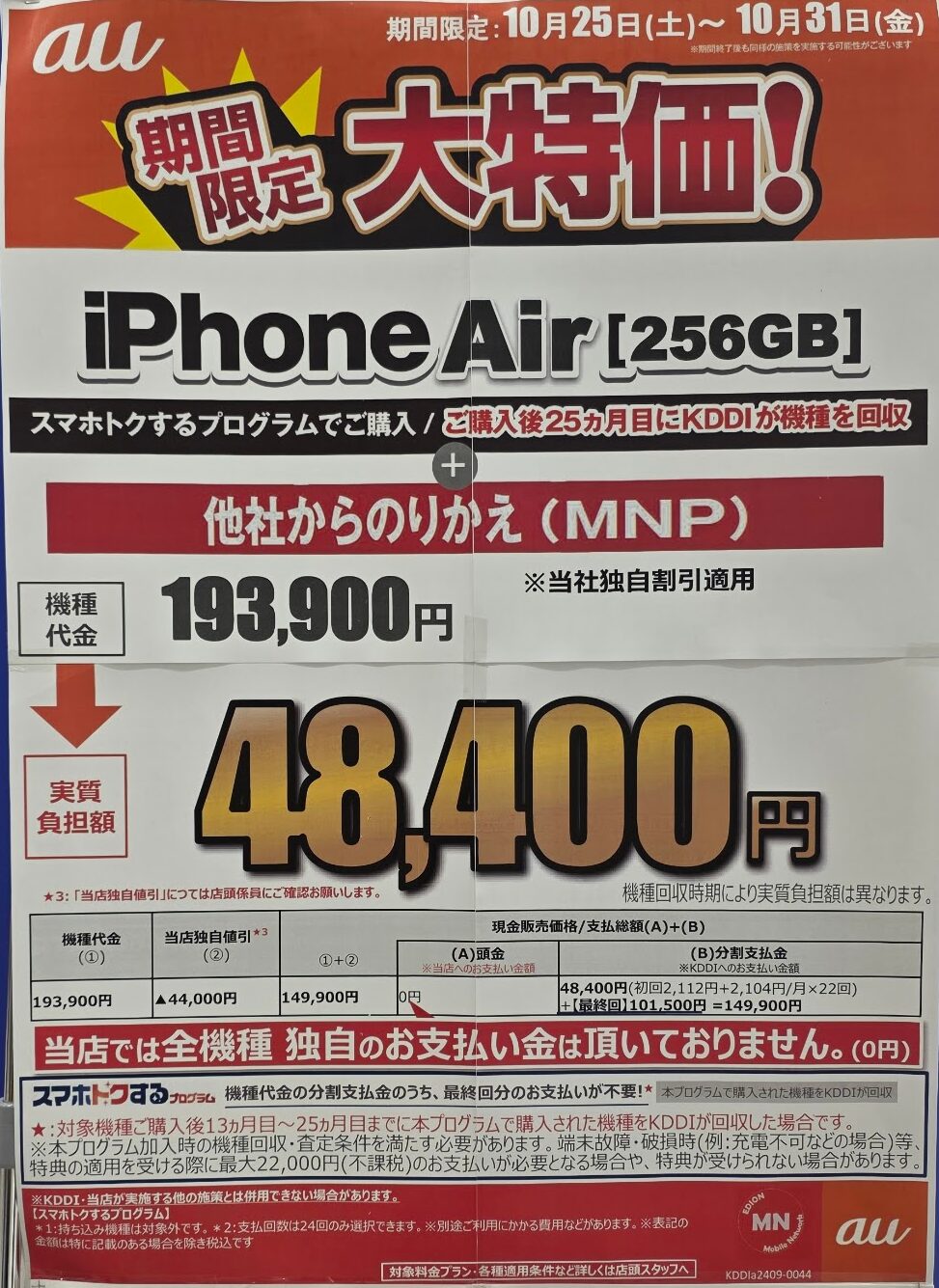 今週の施策ですが、iPhone17Proがauで投げ貸しされています。