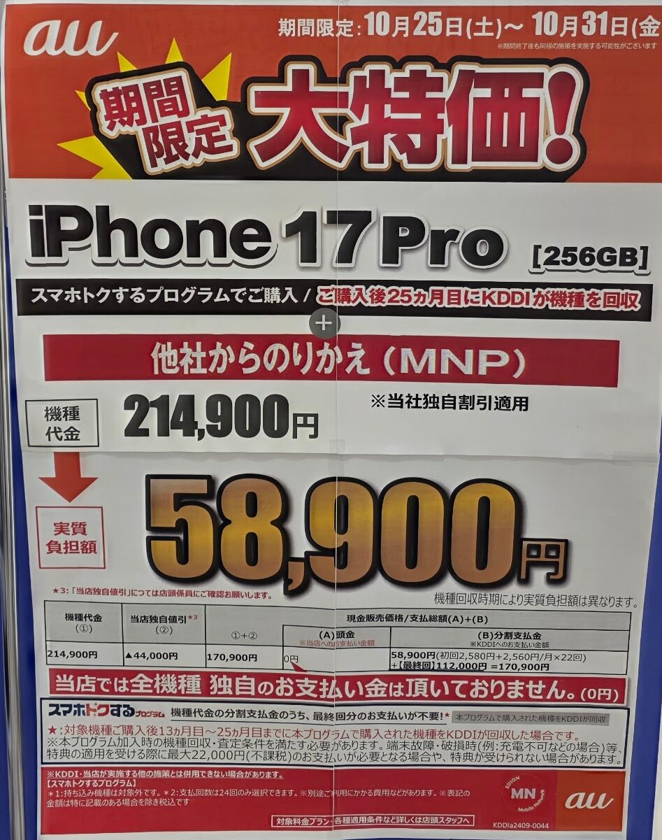 今週、auが緊急値下げと銘打ち、iPhone17を大幅値下げしております。