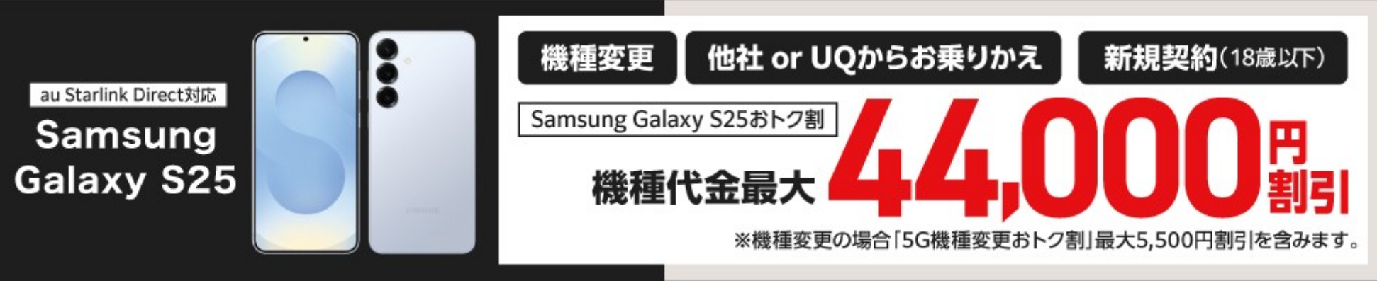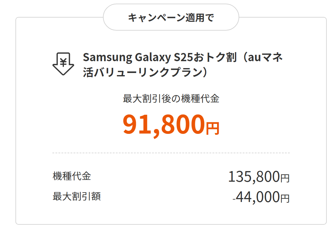 ちなみにGalaxy S25はauでの機種変更でも同様に44,000円の割引がありますので