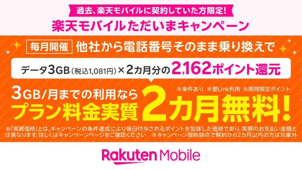 【楽天モバイル】「ただいまキャンペーン」開催!過去のユーザー限定で実質2カ月無料!
