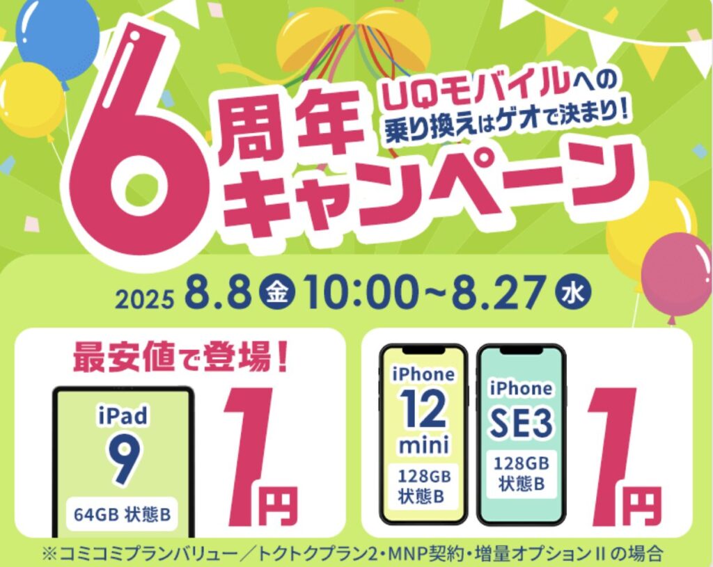 ゲオモバイルの6周年記念キャンペーンが、正直言ってヤバすぎる。iPhone SE第3世代、iPhone 12 mini、iPadまで一括1円って、もはや「バグった価格設定」レベルだ。UQ mobileとのセット契約が条件だが、通常2〜3万円する中古端末が1円で手に入るなんて、見... -