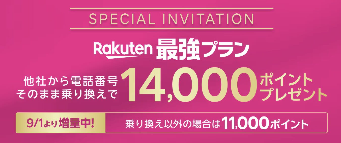 このキャンペーンでは、携帯番号ポータビリティ(MNP)で楽天モバイルに乗り換えると、通常の13,000ポイントに加えて、さらに1,000ポイントを上乗せして合計14,000ポイントを獲得できます。かなりの好条件となっています。