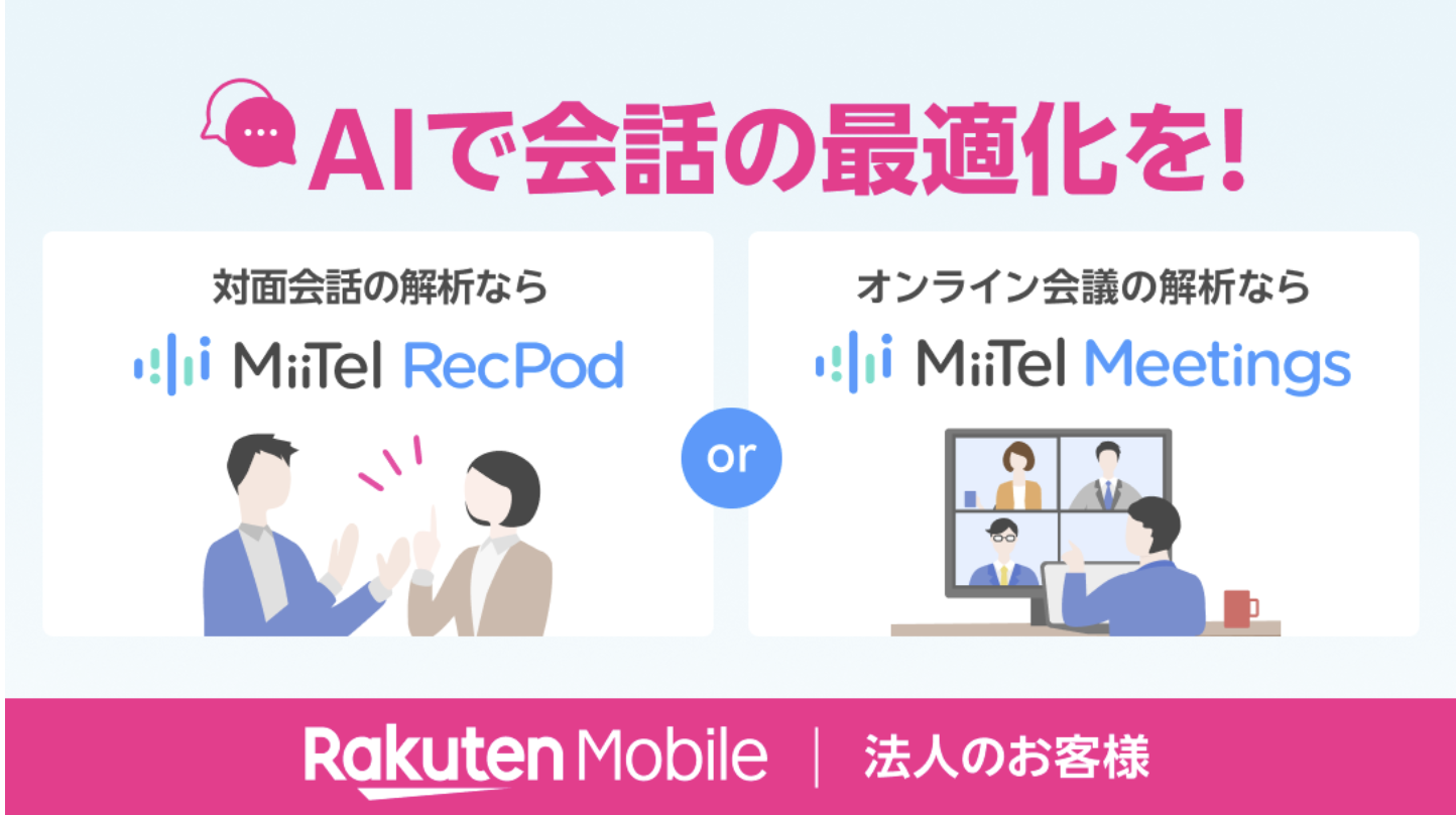 楽天モバイル2025年12月23日楽天モバイル、法人向けAI音声サービス開始!「MiiTel RecPod」「MiiTel Meetings」で対面・オンライン会話を自動文字起こし+分析