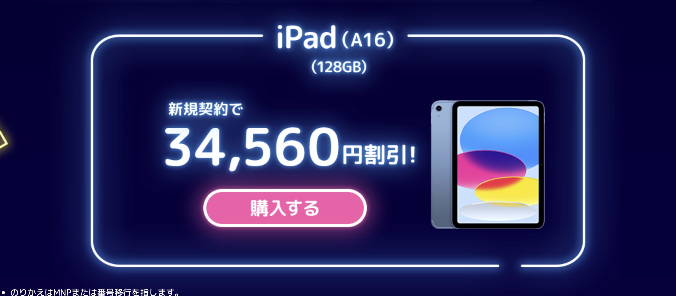 ソフトバンク、ブラックフライデータイムセールでiPad(A16)が激安。2年利用で月額550円/2年総額13,200円。新規契約で34,560円値引き、2年返却時の特典利用料は0円。