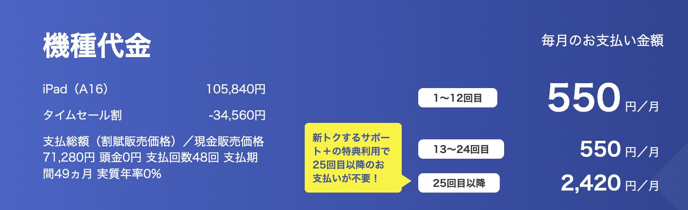 でもiPad A16は、新品で月額550円なら文句なし。セルラーモデルだから外出先でも使えるし、2年後に返却すれば追加料金もゼロ。