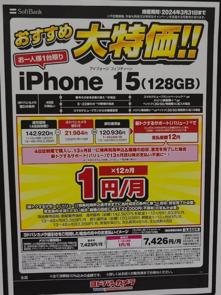 ソフトバンクのiPhone15キャンペーン!「iPhone 15」が年間たったの1円で利用可能! 2024年3月30日、ヨドバシカメラのソフトバンクコーナーでは先週に引き続き、最新のiPhone 15が、1年間わずか1円で手に入るというキャンペーンが継続されています。この破... -
