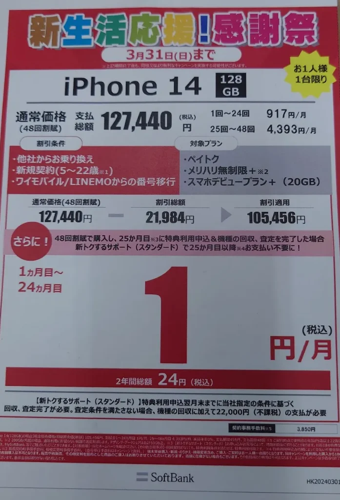 【ケーズデンキ】iPhone 14を実質1円で!MNP利用者限定の衝撃キャンペーン開催中! 2024年3月30日、ケーズデンキのソフトバンクコーナーでは、他社からの乗り換え(MNP)を利用する顧客を対象に、驚異の「iPhone 14実質1円」を行なっています。このプロモ... -