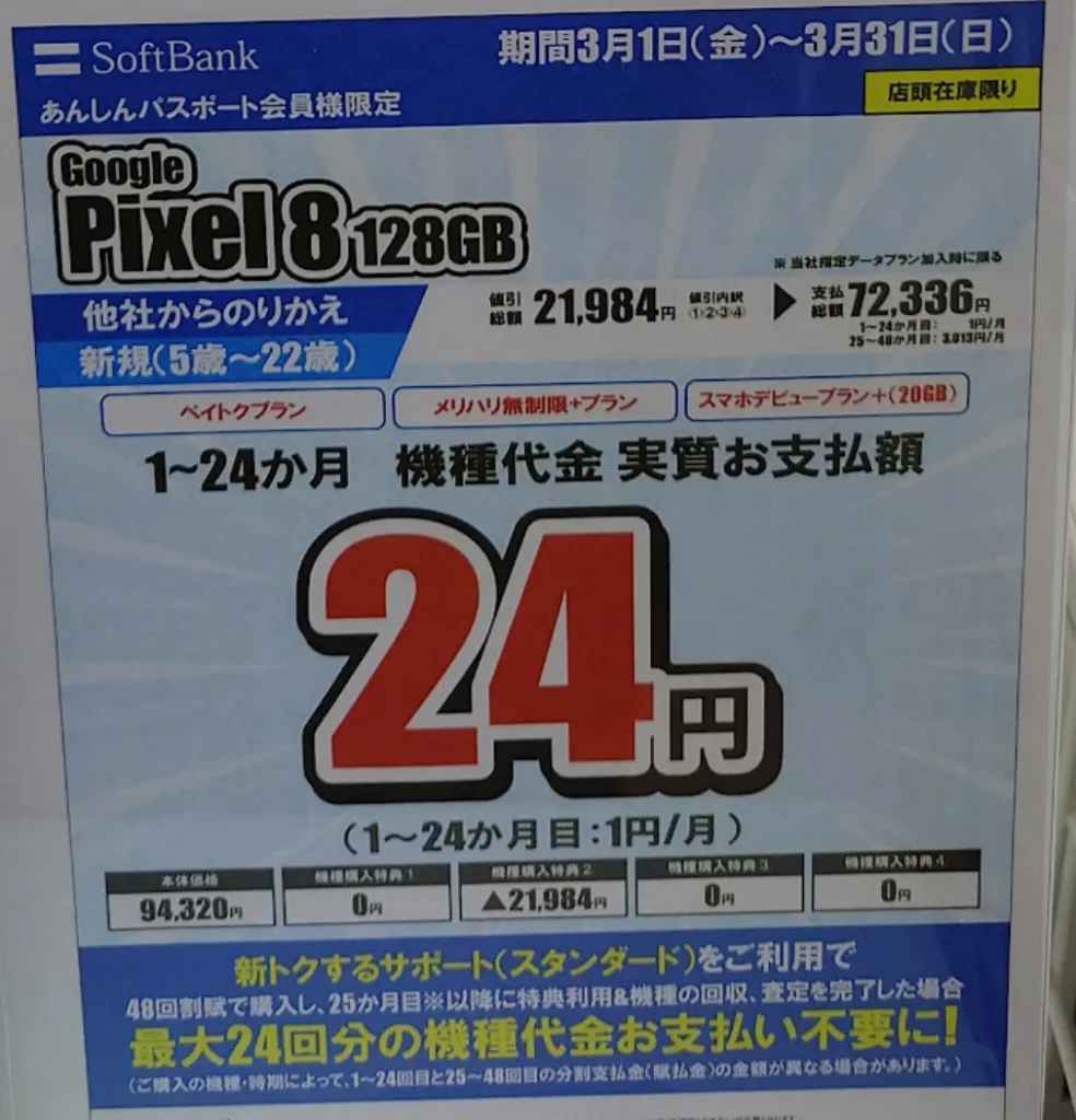 ヨドバシカメラ「Pixel7a」がMNPで実質1円で投げ貸し 2024年3月30日調査してきました。ヨドバシカメラでは、「Pixel7a」が、MNPで実質1円で投げ貸しとなっています。 新トクするサポート(スタンダード)で、24ヶ月で端末返却が条件となっております。 本... -
