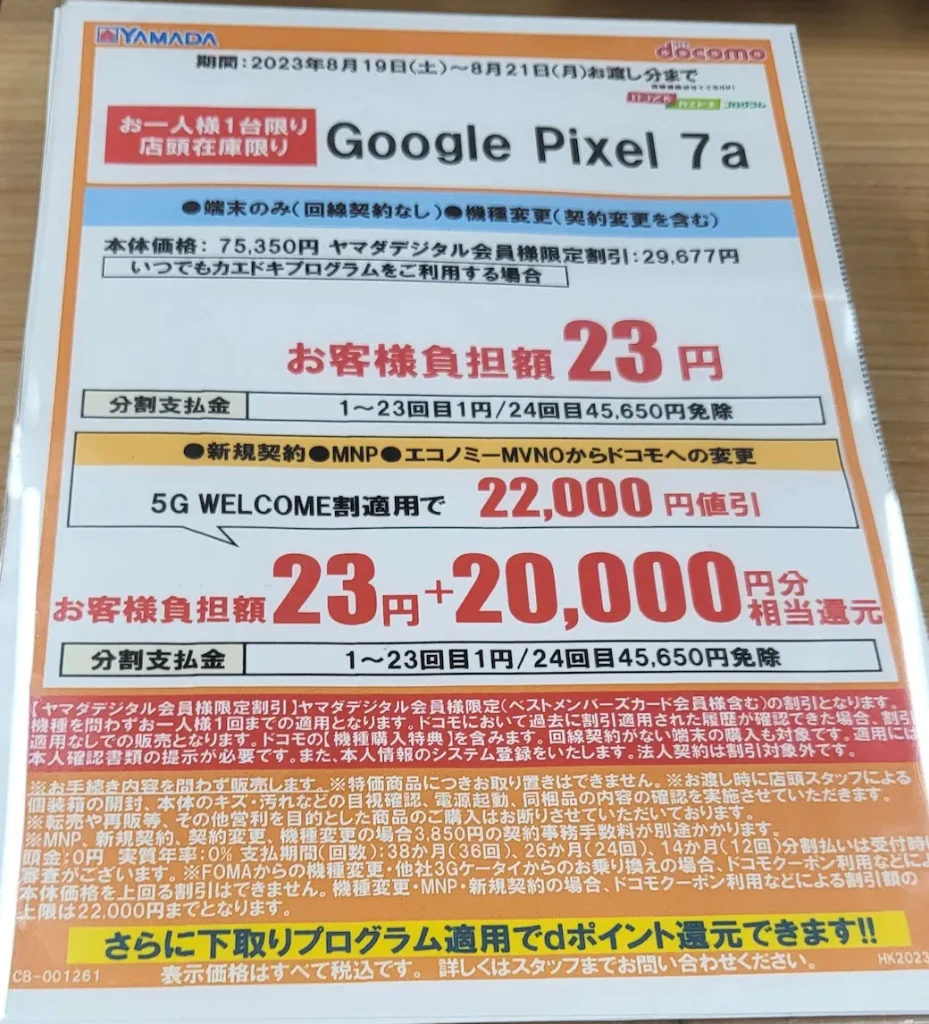 ヤマダ電機では、「Pixel7a」が、MNPで実質1円+20,000円の商品券または現金還元となっています。 irumoでも契約可能。事務手数料は3,850円(税込)。8/21(月)まで。 週末から月曜にかけての施策のようですが、急いでゲットしましょう!