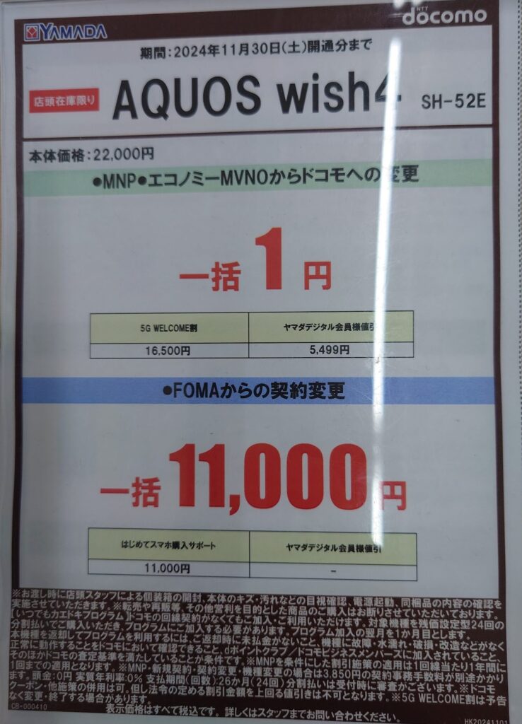 2024年11月2日に調査したところ、ヤマダ電機で「AQUOS Wish4」が一括1円になっているのを発見しました。 ヤマダ電機でAQUOS Wish4が大幅値下げです。MNPでの乗り換えにはなりますが、一括1円での販売となっています。 これならかなりお得に機種変更ができ...