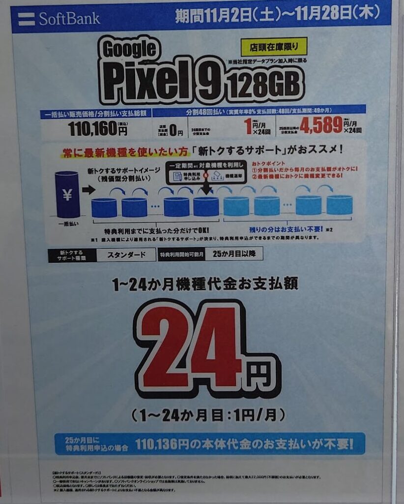 【11月9日最新】iPhone 16裏施策・iPhone15 1円・Pixel 8 24800円・Pixel9 1円・OPPO A79一括1円・AQUOS wish4一括1円・iPhone 14 1円・iPhone 15 3円・Xperia 10Ⅴ 一括9824円