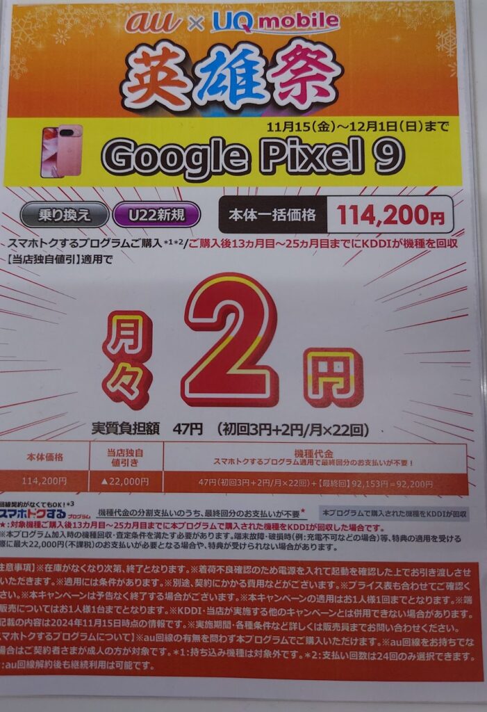 【衝撃】auでPixel9をついに実質2円!2年間47円でレンタル開始