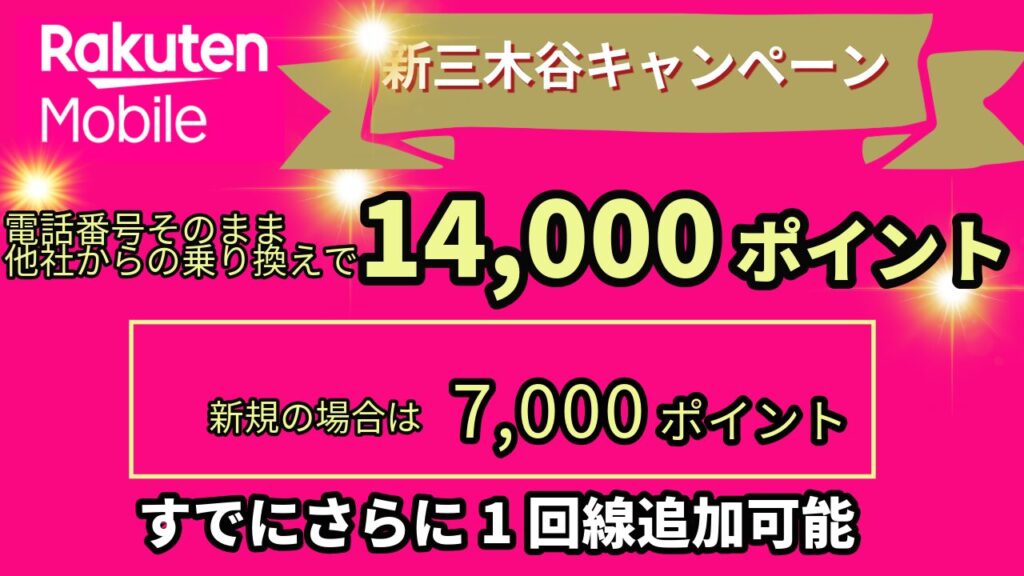 楽天モバイル「三木谷浩史の特別なお客様キャンペーン」が条件変更 楽天モバイルは、新キャンペーン「三木谷浩史の特別なお客様キャンペーン」を実施中。 このキャンペーンでは、他社からの乗り換え(MNP)で最大14,000ポイント、新規契約でも7,000ポイント... -
