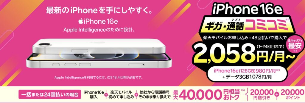 楽天モバイル、iPhone 16eが月額980円から!新型プログラムで激安価格を実現
