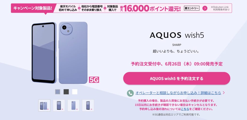 楽天モバイル「AQUOS wish5」6月26日発売!防犯アラート機能付きで実質1万5900円