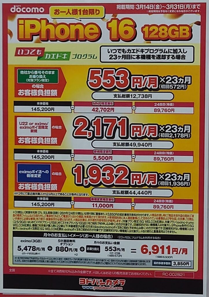 みなさん、今週の家電量販店を見て驚いた方も多いのではないでしょうか。iPhone 16がついに月額553円からのレンタルプランで提供されるようになりました!これは見逃せない情報です。 ドコモが最安値に!先週より100円以上の値下げ ヨドバシカメラのポップ... -